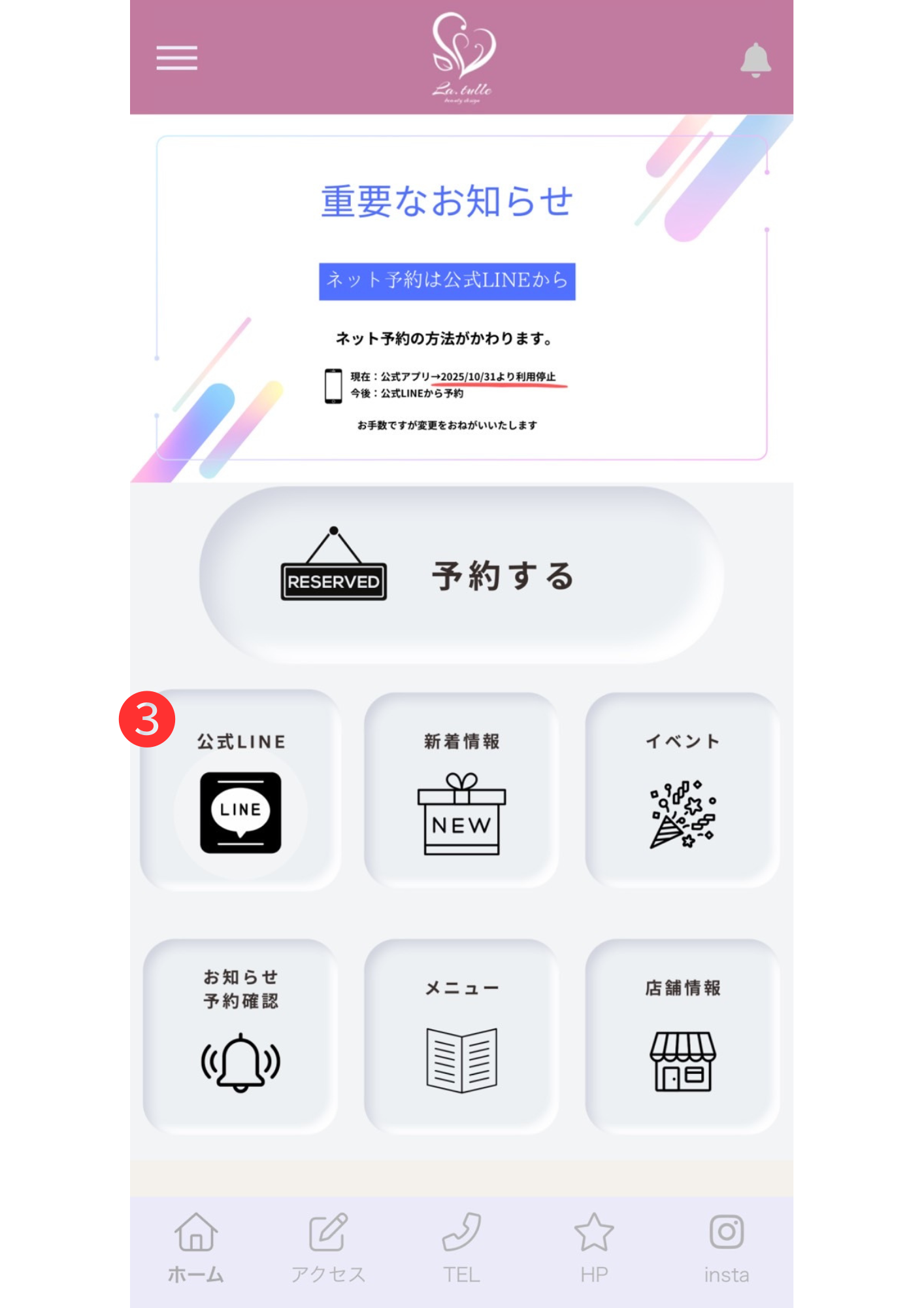 ❸アプリに戻り公式LINEをクリックして友達追加をお願いいたします
