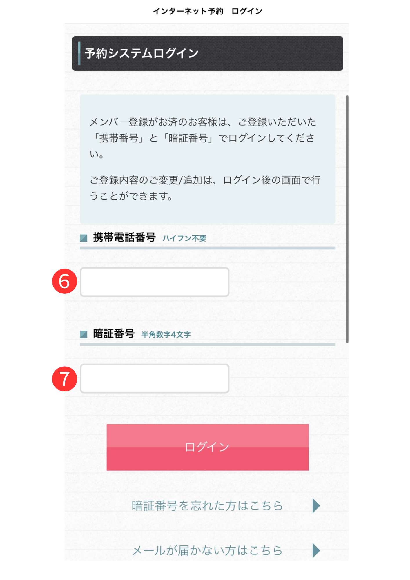 ❻、❼入力していただくとネット予約のマイページにはいれます。